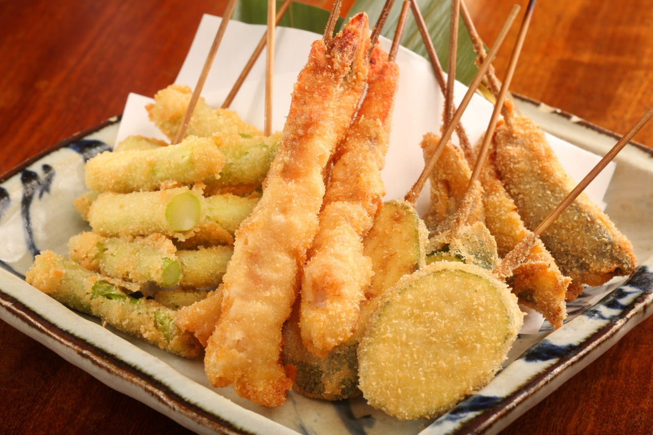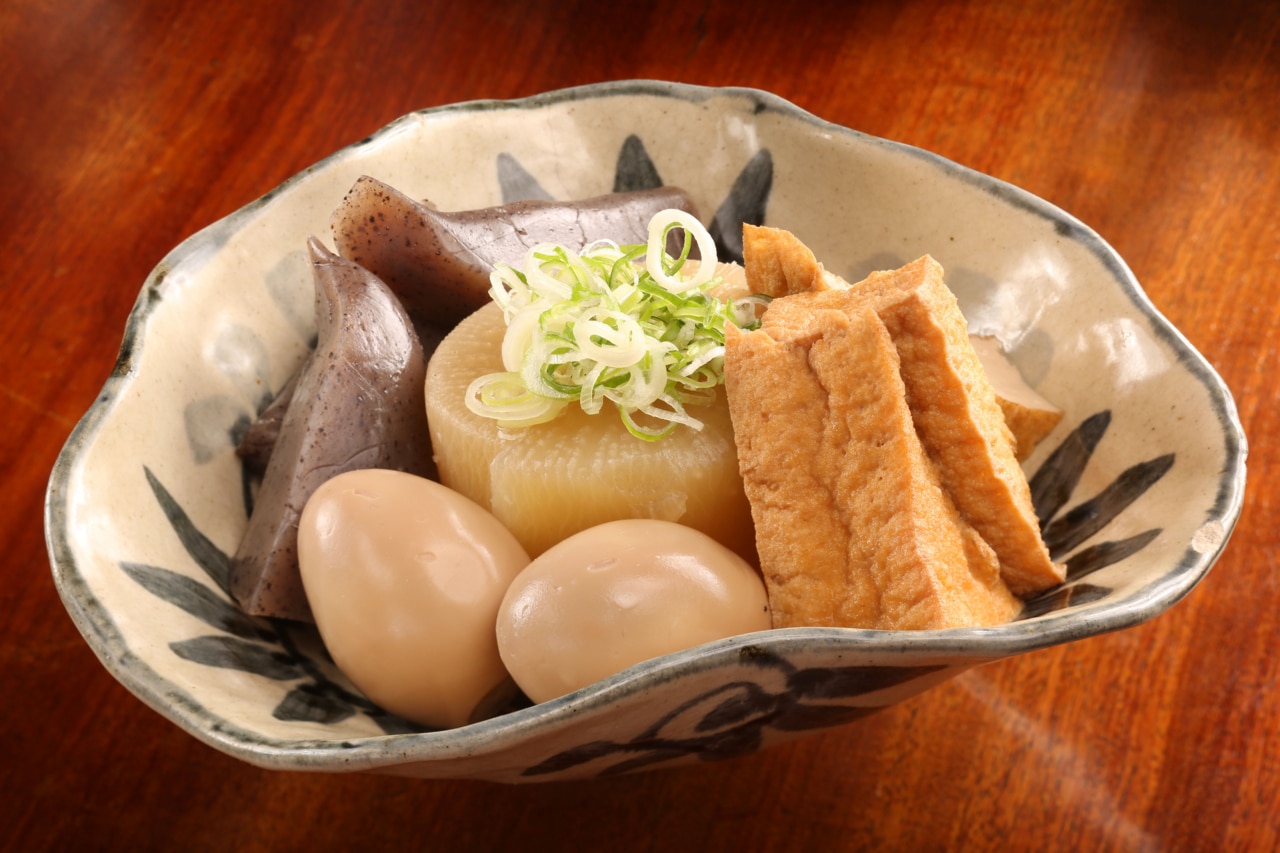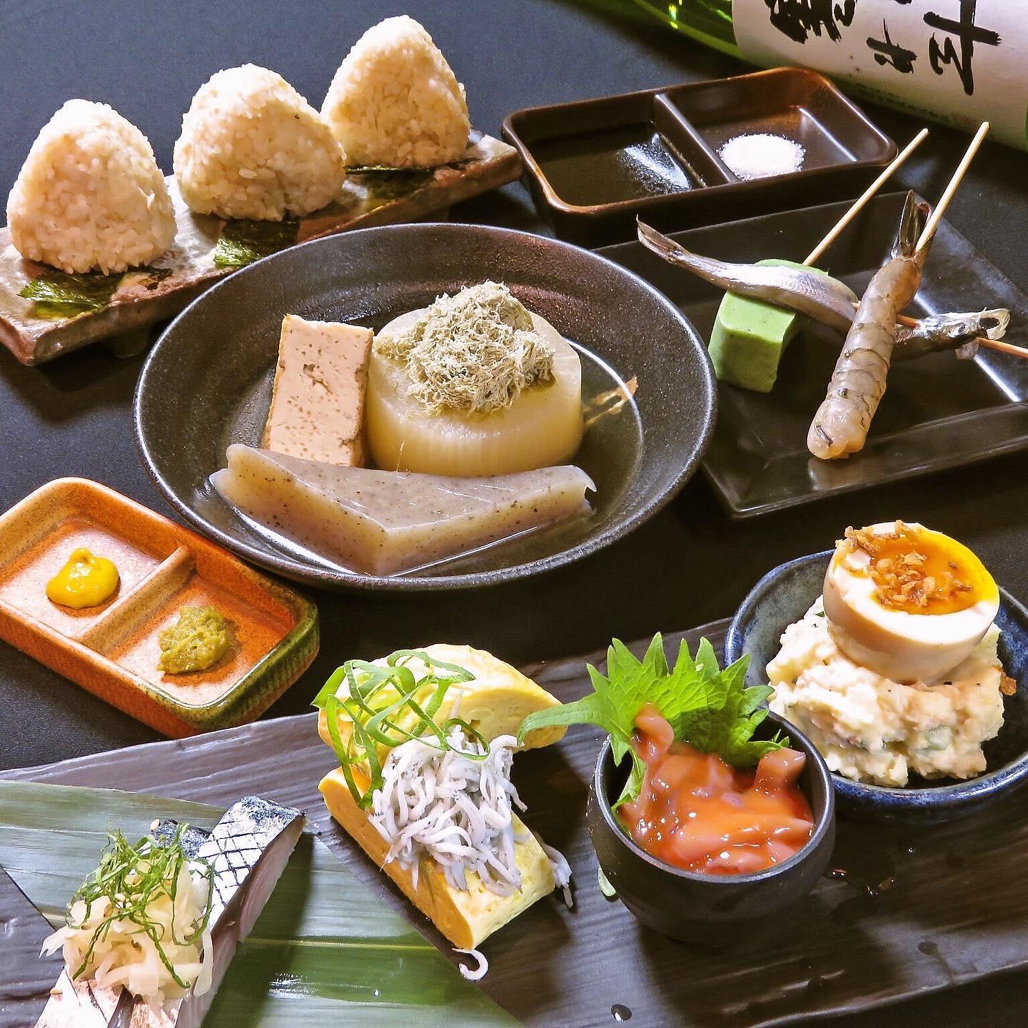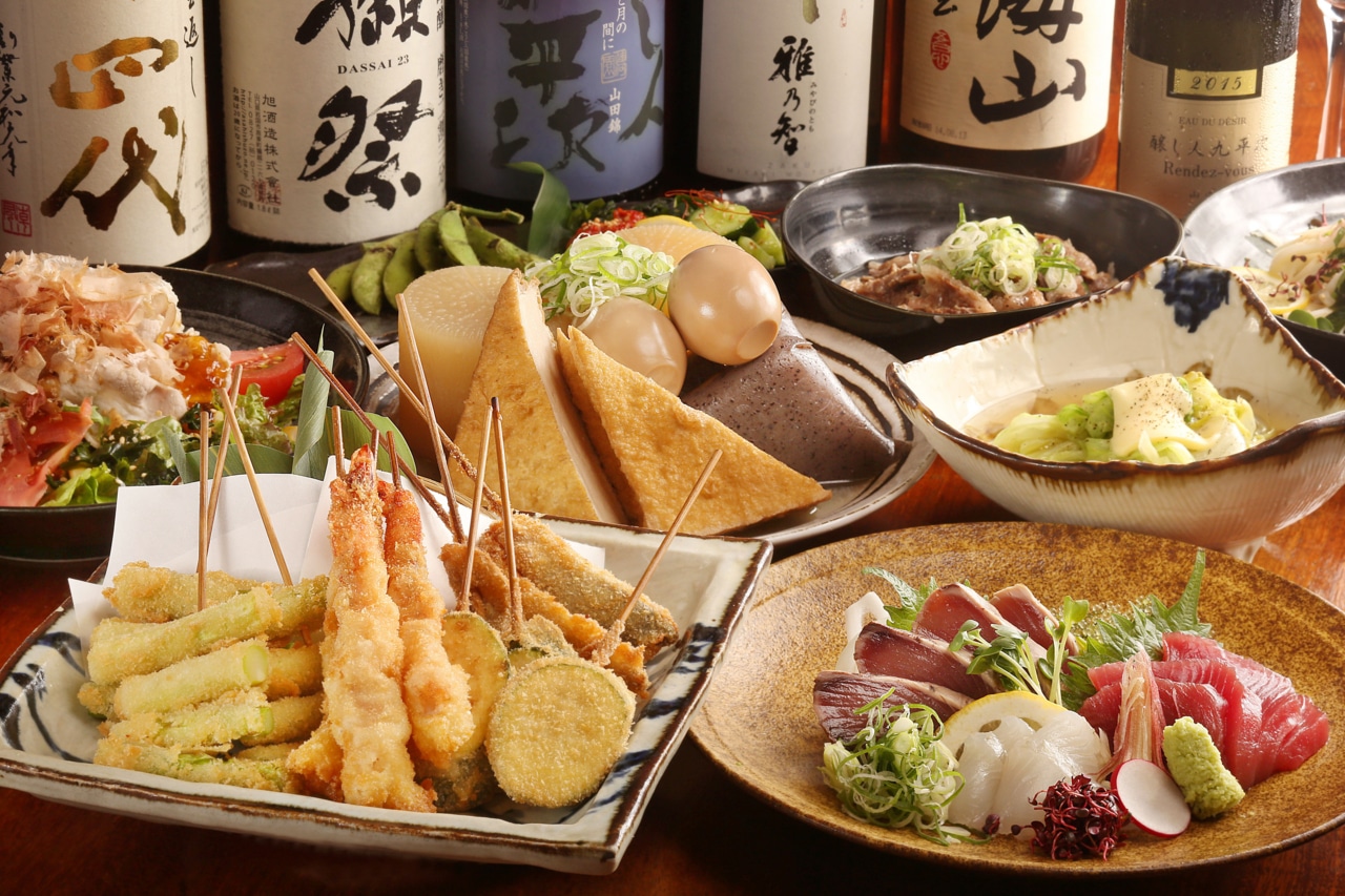 出汁が染みた絶品おでんは厳選された食材を1つひとつ丁寧に仕込み、長時間かけて味をしみ込ませてあります。また、サクサク串揚げもご用意。豚ロースや海老などをはじめ、鴨葱・からし蓮根などの変わり種も!特製の割ソースとアンデス岩塩でお召し上がりください。