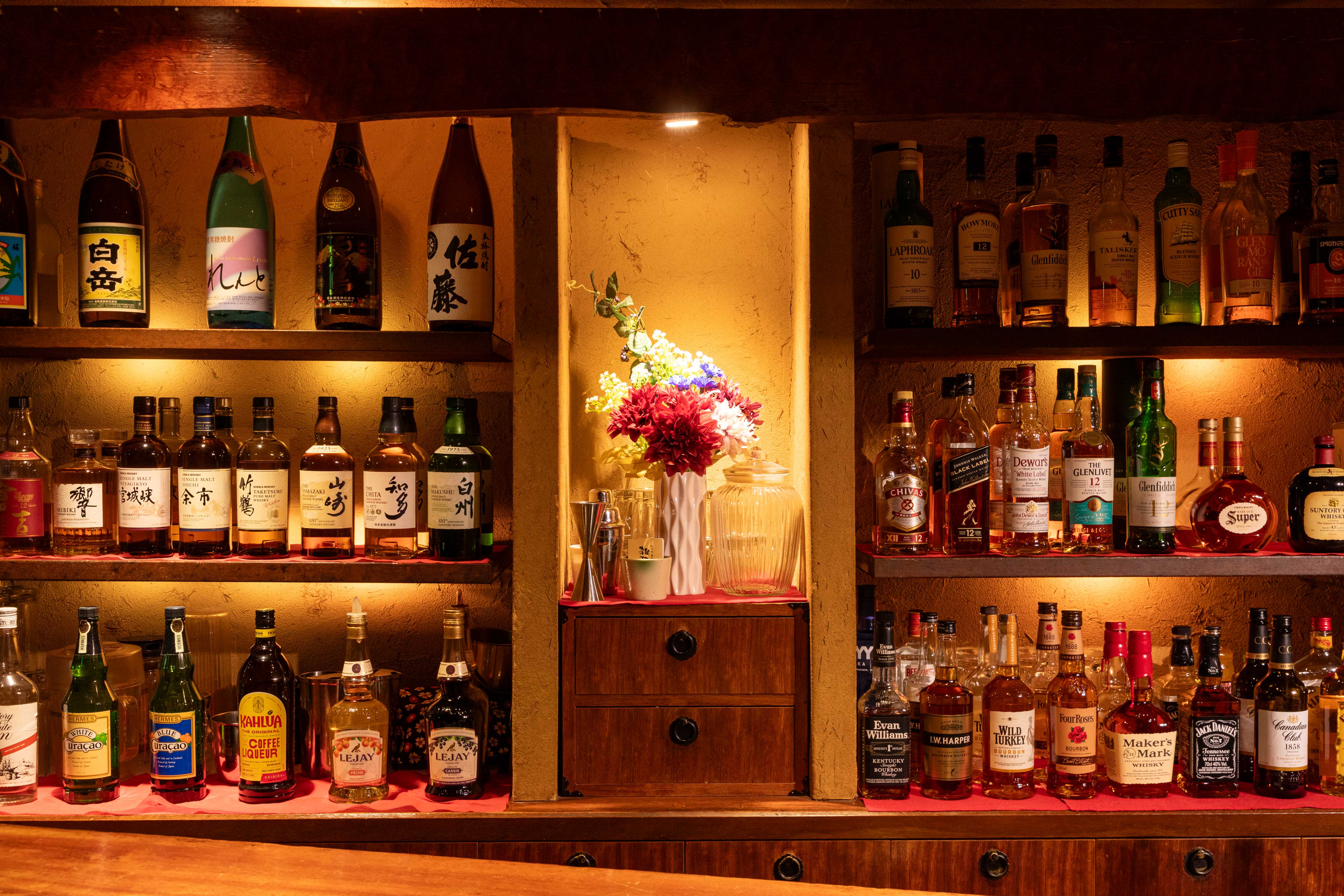 当店自慢、大人の雰囲気漂うカウンターでこだわりのドリンクをご堪能ください。25種以上のウイスキーはジャパニーズウイスキーから世界のウイスキーまで取り揃えております。厳選焼酎、梅酒などドリンクメニューは65種以上です。お好みの1杯を探してみてはいかがでしょうか。